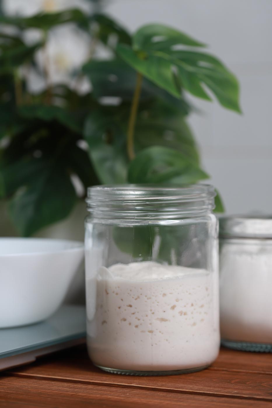Use only half of your Day 1 starter (don’t worry about being exact). Mix the water with the starter first to distribute the bacteria evenly, then add the flour. Again, aim for that pancake-like consistency.