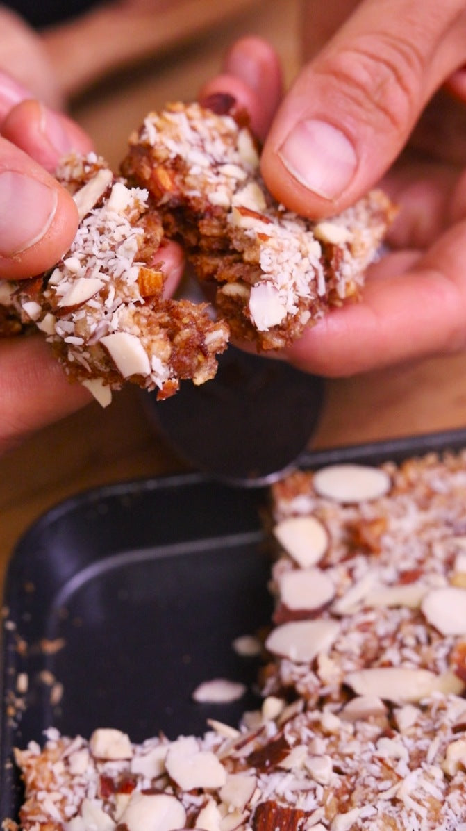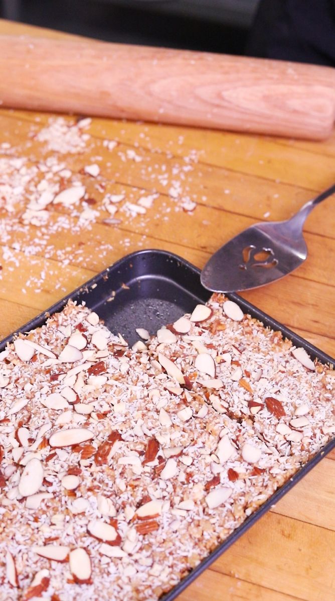 5. Spread evenly in a baking tray. Top with sliced almonds and coconut.