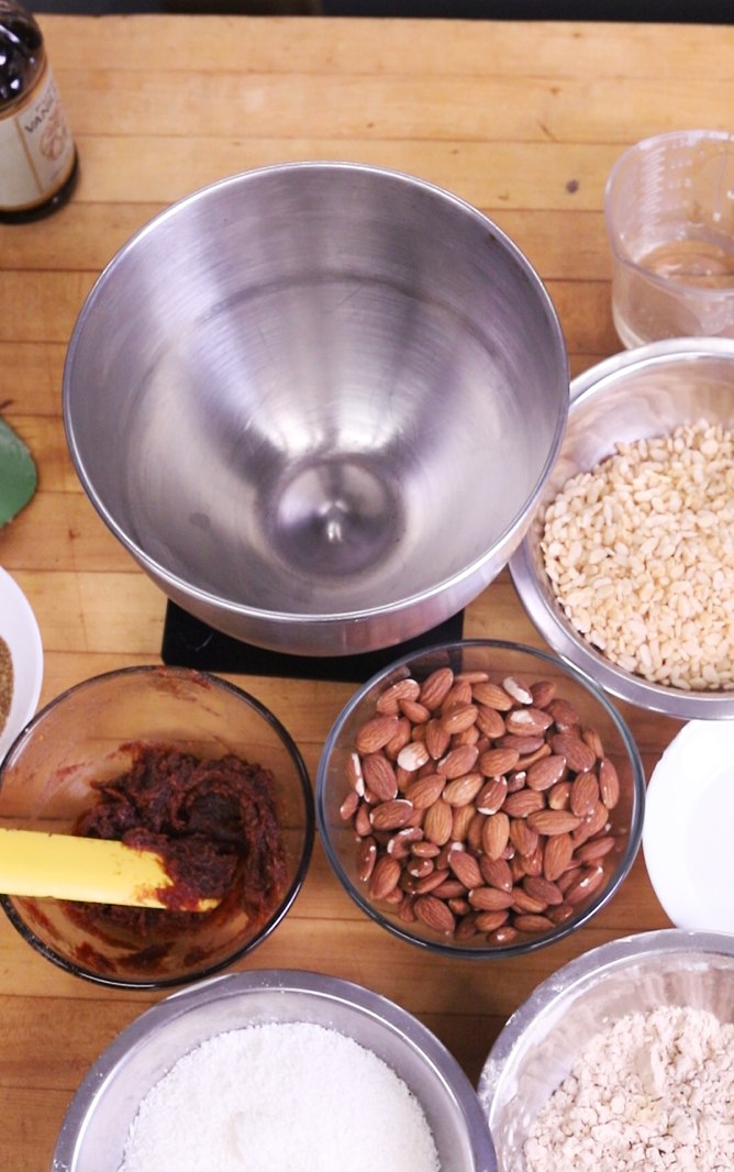 1. Combine date paste, syrups, coconut oil, flax, protein powder and oatmilk in a medium saucepan over low heat.