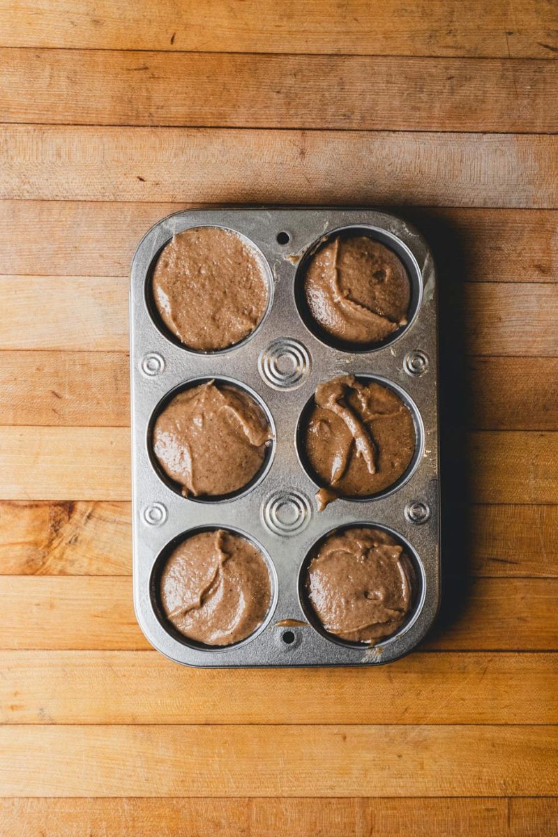 3. Divide batter into a oiled muffin tin, creating a well in each with an oiled ice cream scoop or spoon.