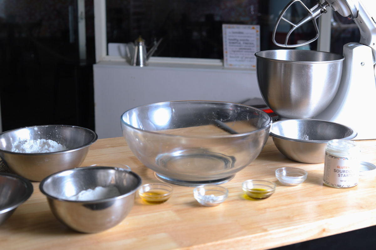 5. Add the wet and dry ingredients together in the bowl of a mixer and mix for 5 minutes at medium speed. Scrape down the bowl if needed. The dough should be a little sticky but not overly sticky that you cannot handle it. It will be less sticky after the proofing process. Do not fold like you would in gluten-full bread.