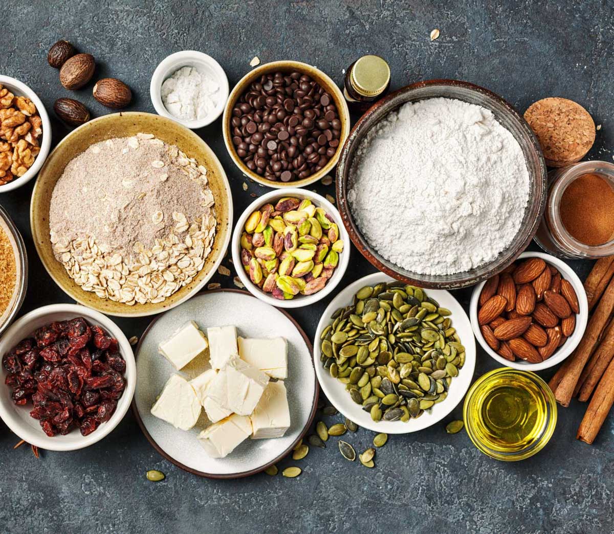 Almond flour, organic hazelnut flour, certified gluten-free organic oat flour, brown sugar, organic coconut oil, homemade organic oat milk, semi-sweet chocolate chips, almonds, vanilla extract, sea salt, organic xanthan gum, baking soda.